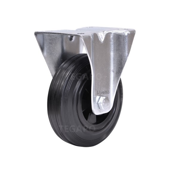 Wieldiameter 125 mm Bouwhoogte 155 mm Rijdend draagvermogen 100 KG Plaatafmeting 105x80mm Boutgat afstand 80x60mm Diameter boutgaten 9mm Vork materiaal Staal Band materiaal Zwart rubber Band hardheid Shore A 90 Velg materiaal Polypropyleen met rollagers Wielas type Metalen as, bout bevestiging Temperatuur -20/ +60°C -