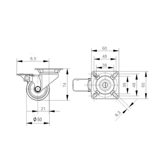 Wieldiameter 50 mm Bouwhoogte 74 mm Rijdend draagvermogen 150 KG Vork materiaal Geperst staal (verzinkt) Vork lager Dubbele kogeldraaikrans Soort rem Dubbel, wiel - draaikrans Band materiaal Polyurethaan Band hardheid Shore D 40 Band breedte 25 mm Velg materiaal Polypropyleen met kogellager Wielas type Metalen as, bout bevestiging Temperatuur -10/ +40°C Zwenkradius 80 mm Eigen gewicht 0,432 KG Keuringsnorm EN 12532 Garantie 5 jaar Top kwaliteit zwenkwiel