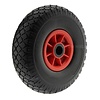 Materiaal wiel Foamband massief antilek Materiaal velg 1-delige kunststof velg rood Wiel diameter 260 mm velg diameter 120 mm Asgat diameter 20 mm Naaflengte 75 mm Soort lager Naaldlager Draagvermogen 150 KG Bandprofiel Blok profiel Bandbreedte 75 mm Bandmaat 3.00-4 Eigen gewicht 1,3 KG -
