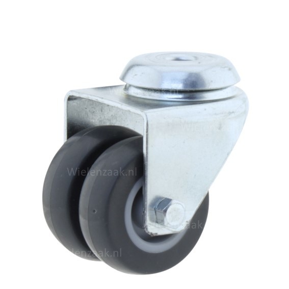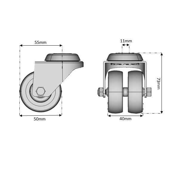 Wieldiameter 50 mm Bouwhoogte 73 mm Rijdend draagvermogen 80 KG Diameter bevestigingsgat 11 mm Vork materiaal Geperst staal (verzinkt) Vork lager Dubbele kogeldraaikrans Band materiaal Niet-strepende thermoplastische rubberband Band hardheid Shore A 90 Band breedte 17 mm Velg materiaal Polypropyleen met glijlager Wielas type Metalen as, bout bevestiging Temperatuur -20/ +60°C Zwenkradius 55 mm Garantie 3 jaar -