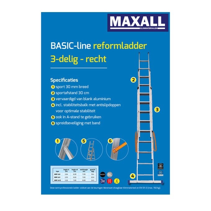 Semi-professionele 3-delige reformladder BASIC-line van blank aluminium met rechte ladderbomen en spreidbeveiliging met band. Deze 'glazenwassersladder' heeft een sportbreedte van 30 mm en een sportafstand van 30 cm. Deze 3-delige ladder is zowel als opsteek- als reformladder in A-stand te gebruiken. De verplichte stabiliteitsbalk wordt los bijgeleverd en is eenvoudig te monteren.
