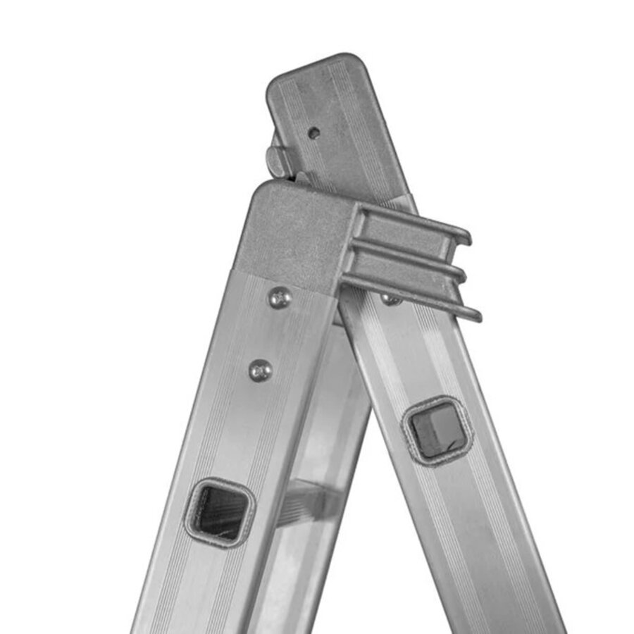 Semi-professionele 2-delige reformladder BASIC-line van blank aluminium met rechte ladderbomen en spreidbeveiliging met band. Deze 'glazenwassersladder' heeft een sportbreedte van 30 mm en een sportafstand van 30 cm. Deze 2-delige ladder is zowel als opsteek- als reformladder in A-stand te gebruiken. De verplichte stabiliteitsbalk wordt los bijgeleverd en is eenvoudig te monteren.