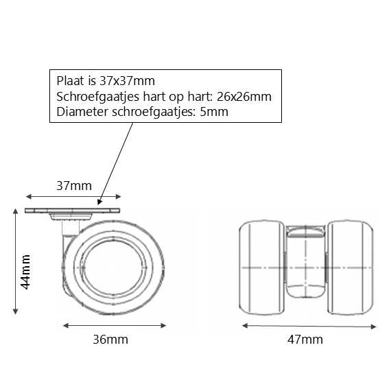 Möbelmann XPU wiel 36mm plaat 36x36mm