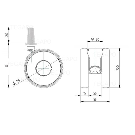 Wieldiameter 75 mm Bouwhoogte 84 mm Stilstaand draagvermogen 200 KG Rijdend draagvermogen 100 KG Bijgeleverde bevestiging Ronde plug 13x26mm Wiel lager Precisie kogellagering Band materiaal Gespoten polyurethaan loopvlak Band hardheid Shore A 92 Band breedte 15 mm Krans diameter 30 mm Velg materiaal Polyamide Temperatuur -20/ +60°C Zwenkradius 65 mm Eigen gewicht 0,152 KG Keuringsnorm EN 12528 Garantie 5 jaar -