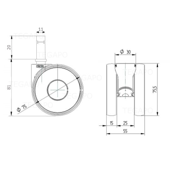Wieldiameter 75 mm Bouwhoogte 81 mm Stilstaand draagvermogen 200 KG Rijdend draagvermogen 100 KG Bijgeleverde bevestiging Stift 11x20mm Wiel lager Precisie kogellagering Band materiaal Gespoten polyurethaan loopvlak Band hardheid Shore A 92 Band breedte 15 mm Krans diameter 30 mm Velg materiaal Polyamide Temperatuur -20/ +60°C Zwenkradius 65 mm Eigen gewicht 0,152 KG Keuringsnorm EN 12528 Garantie 5 jaar -