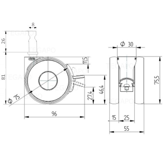 Wieldiameter 75 mm Bouwhoogte 81 mm Stilstaand draagvermogen 200 KG Rijdend draagvermogen 100 KG Bijgeleverde bevestiging Stift 8x26mm Wiel lager Precisie kogellagering Band materiaal Gespoten polyurethaan loopvlak Band hardheid Shore A 92 Band breedte 15 mm Krans diameter 30 mm Velg materiaal Polyamide Temperatuur -20/ +60°C Zwenkradius 81 mm Eigen gewicht 0,171 KG Keuringsnorm EN 12528 Garantie 5 jaar -