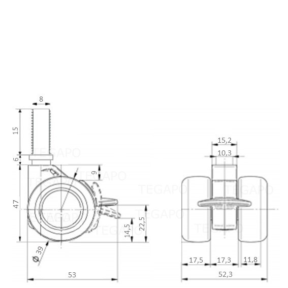 - Zwenkwielen met M8 schroefdraad