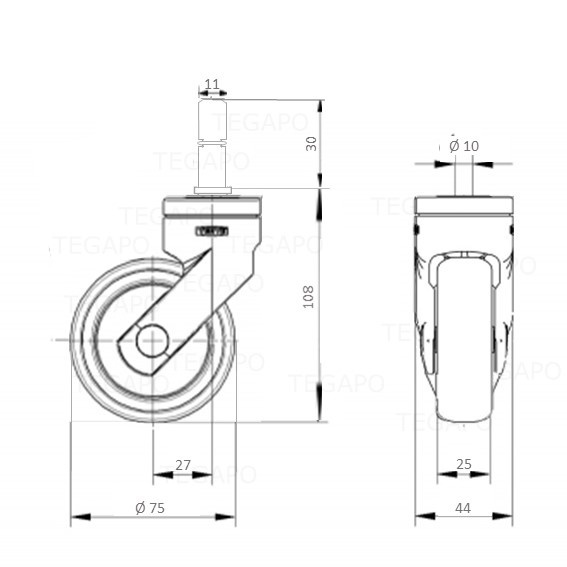 Wieldiameter 75 mm Bouwhoogte 108 mm Draagvermogen 150 KG Bijgeleverde bevestiging Stift 11x30mm Wiel lager Precisiekogellager, afdekkap voor hygiëne/vuilopbouw Band materiaal Zacht, Tenteprene thermoplastisch rubber Band hardheid Shore A 87 Band breedte 25 mm Krans diameter 44 mm Velg materiaal Hoogwaardig synthetisch materiaal Temperatuur -10/ +40°C Zwenkradius 64.5 mm Eigen gewicht 0,154 KG Keuringsnorm EN 12530 Garantie 5 jaar -