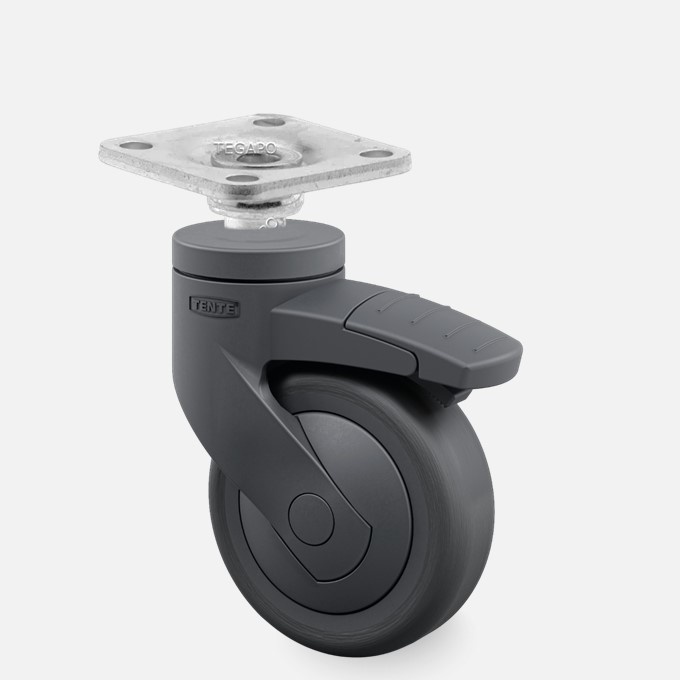 Wieldiameter 75 mm Bouwhoogte 112 mm Draagvermogen 150 KG Bijgeleverde bevestiging Plaat 42x42mm Wiel lager Precisiekogellager, afdekkap voor hygiëne/vuilopbouw Band materiaal Zacht, Tenteprene thermoplastisch rubber Band hardheid Shore A 87 Band breedte 25 mm Krans diameter 44 mm Velg materiaal Hoogwaardig synthetisch materiaal Temperatuur -10/ +40°C Zwenkradius 73 mm Eigen gewicht 0,154 KG Keuringsnorm EN 12530 Garantie 5 jaar -