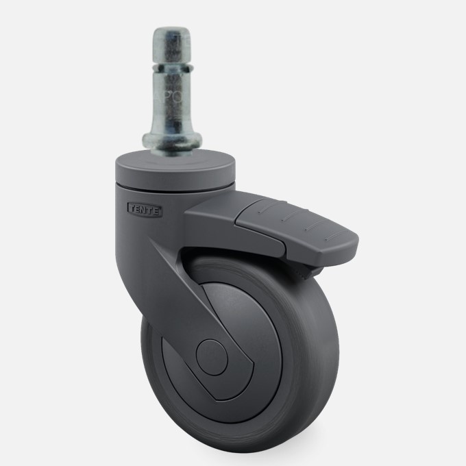 Wieldiameter 75 mm Bouwhoogte 108 mm Draagvermogen 150 KG Bijgeleverde bevestiging Stift 9x24mm Wiel lager Precisiekogellager, afdekkap voor hygiëne/vuilopbouw Band materiaal Zacht, Tenteprene thermoplastisch rubber Band hardheid Shore A 87 Band breedte 25 mm Krans diameter 44 mm Velg materiaal Hoogwaardig synthetisch materiaal Temperatuur -10/ +40°C Zwenkradius 73 mm Eigen gewicht 0,154 KG Keuringsnorm EN 12530 Garantie 5 jaar -