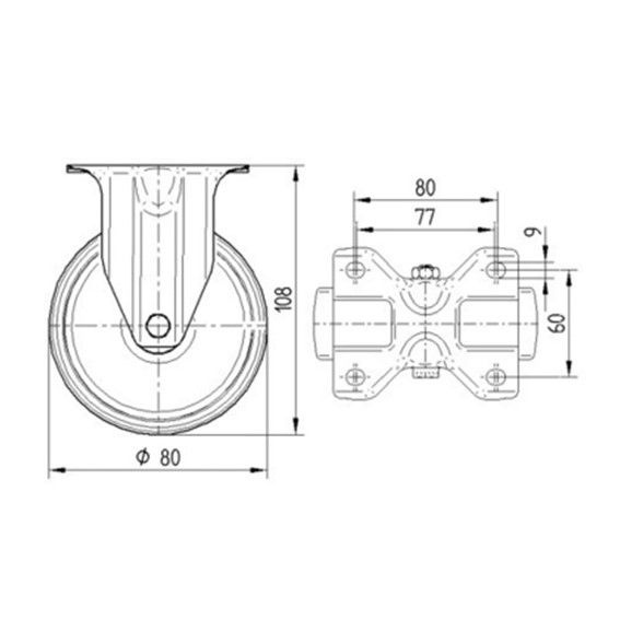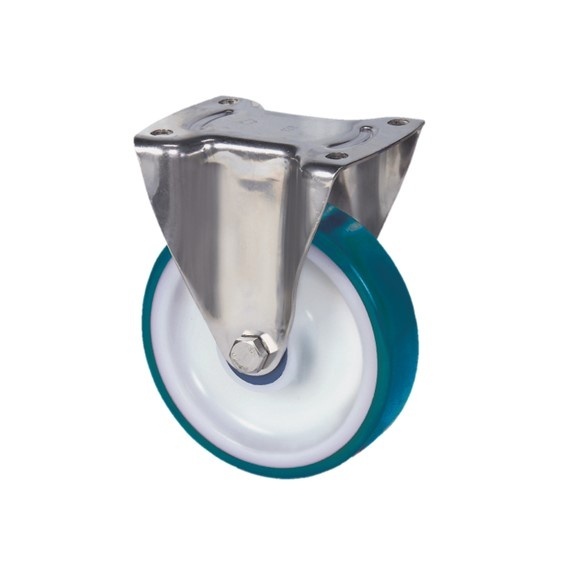 Wieldiameter 80 mm Bouwhoogte 108 mm Rijdend draagvermogen per wiel 100 kg Stilstaand draagvermogen per wiel 200 kg Vork materiaal Roestvrijstaal Band materiaal Gespoten polyurethaan Band hardheid Shore D 42 Band breedte 32 mm Velg materiaal Polyamide met RVS rollager Wielas type RVS metalen as, bout bevestiging Temperatuur -40/ +80°C Eigen gewicht 0,455 KG Keuringsnorm EN 12532 Garantie 5 jaar 8478UAD080P62 blue Let op, de foto wijkt af van de werkelijkheid. Op de foto ziet u de 100mm variant.