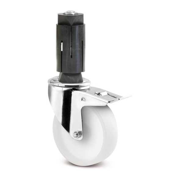 Dit wiel is voorzien van een kunststof uitzetbevestiging die in een ronde buis past met een binnendiameter van 27-30mm. Het zwarte gedeelte drukt u in de ronde buis. Doormiddel van een inbussleutel draait u via de onderzijde van het zwenkwiel (bij het kransgedeelte) de bout aan waardoor de bevestiger uitzet. Deze kunt u stevig aandraaien, zodat het kunststof gedeelte tegen de binnenwand van de ronde buis zal klemmen en het zwenkwiel een sterke montagebevestiging krijgt.