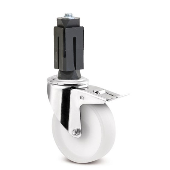 Wieldiameter 100 mm Bouwhoogte 128 mm Rijdend draagvermogen per wiel 150 kg Stilstaand draagvermogen per wiel 300 kg Vork materiaal Roestvrijstaal Vork lager Dubbele kogeldraaikrans Band materiaal Polyamide Band hardheid Shore D 75 Band breedte 36 mm Velg materiaal Polyamide met RVS glijlager Wielas type RVS metalen as, bout bevestiging Temperatuur -40/ +80°C Zwenkradius 123 mm Eigen gewicht 0,778 KG Keuringsnorm EN 12532 Garantie 5 jaar Uitleg monteren in vierkante koker