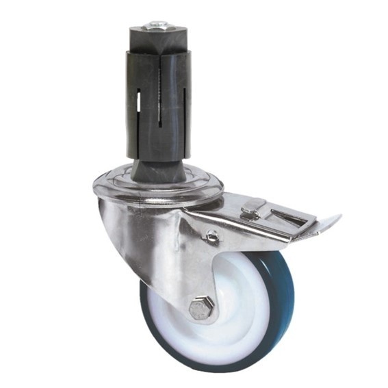 Dit wiel is voorzien van een kunststof uitzetbevestiging die in een ronde buis past met een binnendiameter van 24-27mm. Het zwarte gedeelte drukt u in de ronde buis. Doormiddel van een inbussleutel draait u via de onderzijde van het zwenkwiel (bij het kransgedeelte) de bout aan waardoor de bevestiger uitzet. Deze kunt u stevig aandraaien, zodat het kunststof gedeelte tegen de binnenwand van de ronde buis zal klemmen en het zwenkwiel een sterke montagebevestiging krijgt.