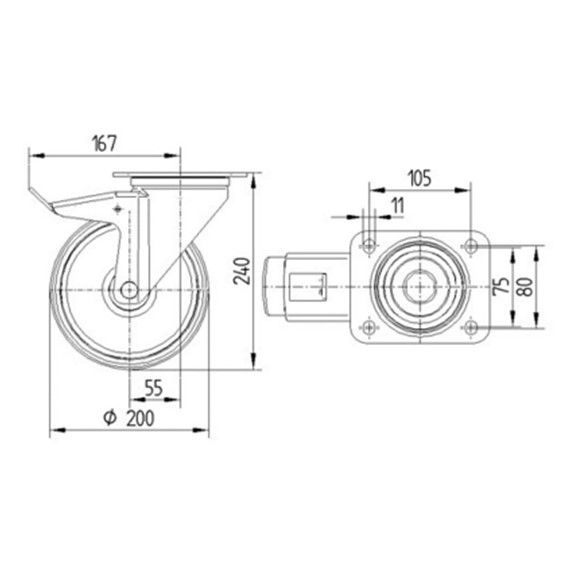 Wieldiameter 200 mm Bouwhoogte 240 mm Rijdend draagvermogen per wiel 300 kg Stilstaand draagvermogen per wiel 600kg Vork materiaal Roestvrijstaal Vork lager Dubbele kogeldraaikrans Band materiaal Niet-strepende thermoplastische rubberband Band hardheid Shore A 64 Band breedte 46 mm Velg materiaal Polyamide met RVS precisiekogellager, kleine draadvangkappen Wielas type Metalen as, bout bevestiging Temperatuur -20/ +80°C Zwenkradius 167 mm Eigen gewicht 2,956 KG Keuringsnorm EN 12532 Garantie 5 jaar 8477UFC200P63 Let op, de foto wijkt af van de werkelijkheid. Op de foto ziet u de 125mm variant.