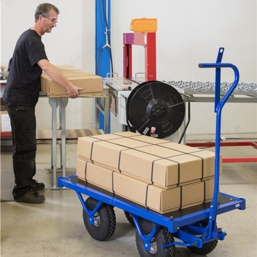 Deze zeer comfortabele en robuust gelaste transportwagen kunt u inzetten voor dagelijks intensief gebruik. De kwaliteit is zeer hoogstaand wat zich uit is het complete gebruik van deze wagen. Met de fijne handgreep manoeuvreert u deze wagen overal tussendoor. Op het moment dat u de handgreep omhoog doet gaat de wagen op de parkeerrem. Het multiplex blad zorgt ervoor dat deze wagen ook volledig geschikt is voor buitengebruik.