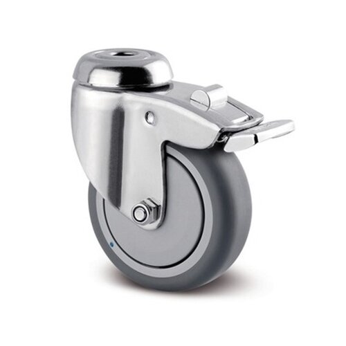RVS zwenkwielen met boutgatbevestiging en kogellagering in de draaikrans. De wielen zijn ook voorzien van kogellagering en afdekkappen. Streeploos thermoplastisch rubber voor iedere vloer.