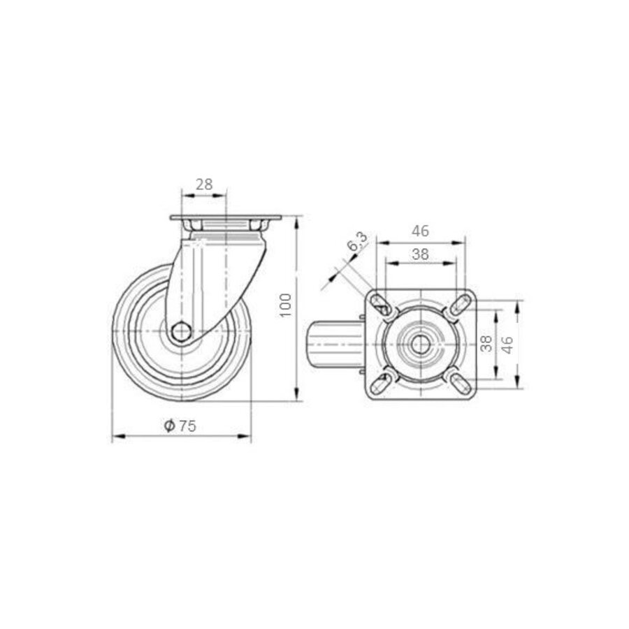 Wieldiameter 75 mm Bouwhoogte 100 mm Rijdend draagvermogen 60 KG Vork materiaal Geperst staal (verzinkt) met zwarte poedercoating Vork lager Dubbele kogeldraaikrans Band materiaal Niet-strepende thermoplastische rubberband zwart Band hardheid Shore A 85 Band breedte 23 mm Velg materiaal Polypropyleen met glijlager Wielas type Metalen as, bout bevestiging Bevestiging Plaat bevestiging Temperatuur -20/ +60°C Zwenkradius 66 mm Eigen gewicht 0.27 KG Garantie 5 jaar -