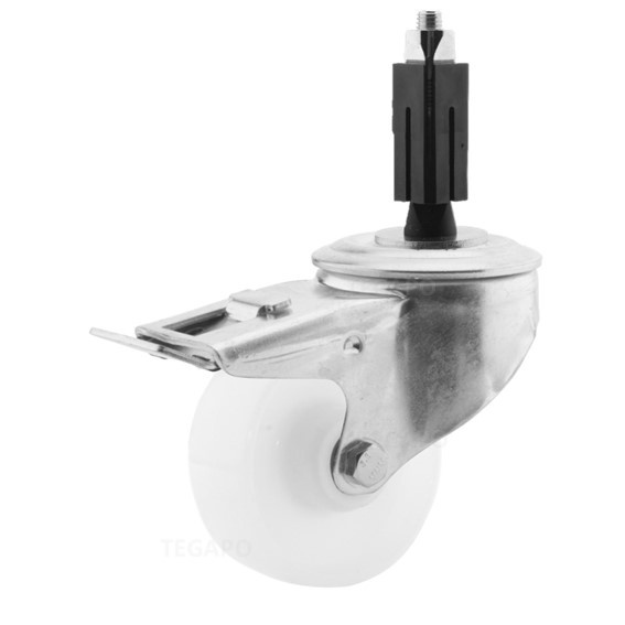 Dit wiel is geschikt voor het rijden op harde vloeren zoals beton, tegels, natuursteen enz. Uitermate geschikt voor zowel binnen als buiten. Deze zijn voorzien van een kunststof uitzetschroef bevestiging: Geschikt om de wielen te bevestigen en te kunnen klemmen in een inwendige kokermaat van 21,5 tot en met 24mm. Door middel van een inbussleutel kan deze van de onderzijde van het zwenkwiel (bij het kransgedeelte) opgedraaid worden om het kunststof gedeelte te klemmen in de koker. Deze kunt u stevig aandraaien, zodat het kunststof gedeelte tegen de binnenwand van de koker zal klemmen en het zwenkwiel een sterke montagebevestiging krijgt.