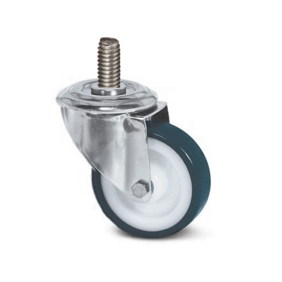 Wieldiameter 125 mm Bouwhoogte 155 mm Rijdend draagvermogen per wiel 150 kg Stilstaand draagvermogen per wiel 300 kg Vork materiaal Roestvrijstaal Vork lager Dubbele kogeldraaikrans Band materiaal Gespoten polyurethaan Band hardheid Shore D 42 Band breedte 32 mm Velg materiaal Polyamide met RVS rollager Wielas type RVS metalen as, bout bevestiging Temperatuur -40/ +80°C Zwenkradius 102,5 mm Eigen gewicht 0,777 KG Keuringsnorm EN 12532 Garantie 5 jaar Aansluiting M12x35 Let op, de foto wijkt af van de werkelijkheid. Op de foto ziet u de 100mm variant.