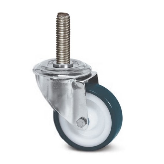 Wieldiameter 80 mm Bouwhoogte 108 mm Rijdend draagvermogen per wiel 100 kg Stilstaand draagvermogen per wiel 200 kg Vork materiaal Roestvrijstaal Vork lager Dubbele kogeldraaikrans Band materiaal Gespoten polyurethaan Band hardheid Shore D 42 Band breedte 32 mm Velg materiaal Polyamide met RVS rollager Wielas type RVS metalen as, bout bevestiging Temperatuur -40/ +80°C Zwenkradius 84,5 mm Eigen gewicht 0,638 KG Keuringsnorm EN 12532 Garantie 5 jaar Aansluiting M12x65 (let op, de bout is niet voldraad, het onderste stukje van de bout is glad. Het gladde gedeelte is lengte:28mm , het schroefdraad heeft een lengte van: 38mm) Let op, de foto wijkt af van de werkelijkheid. Op de foto ziet u de 100mm variant.